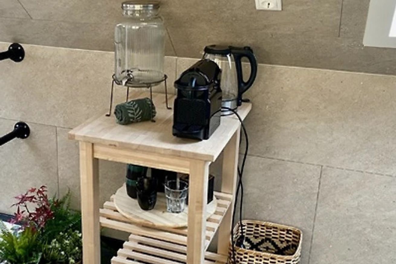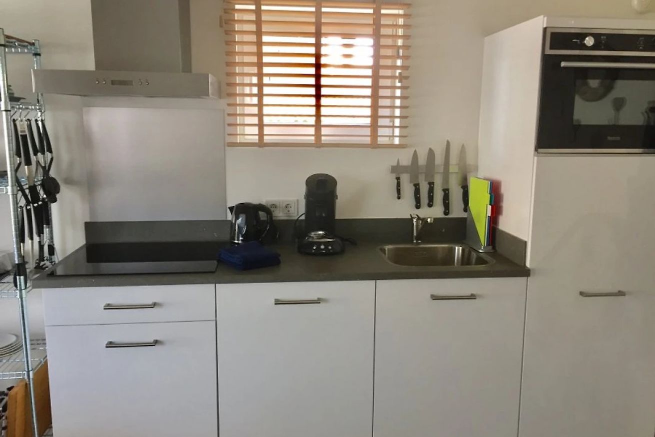 Im Erdgeschoss befindet sich eine bequeme Sitzecke mit Fernseher, der über deutsche Pogramme verfügt. Dieser Fernseher verfügt auch über eine App, mit der Sie sich in Ihr Netflix-Konto einloggen können. Es gibt einen geräumigen Essbereich und eine komplett ausgestattete Küche, mit 4-Flammen-Induktionskochfeld.