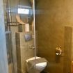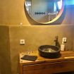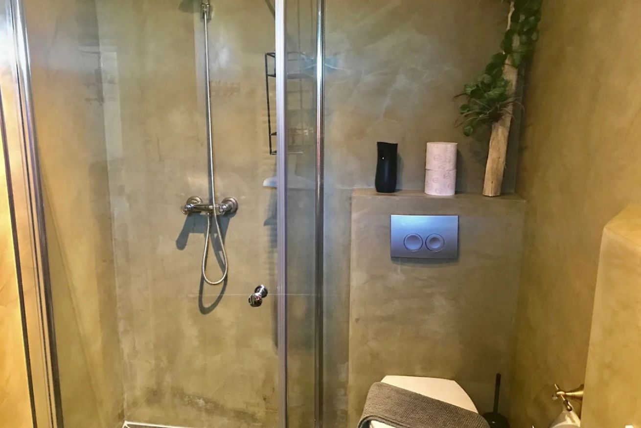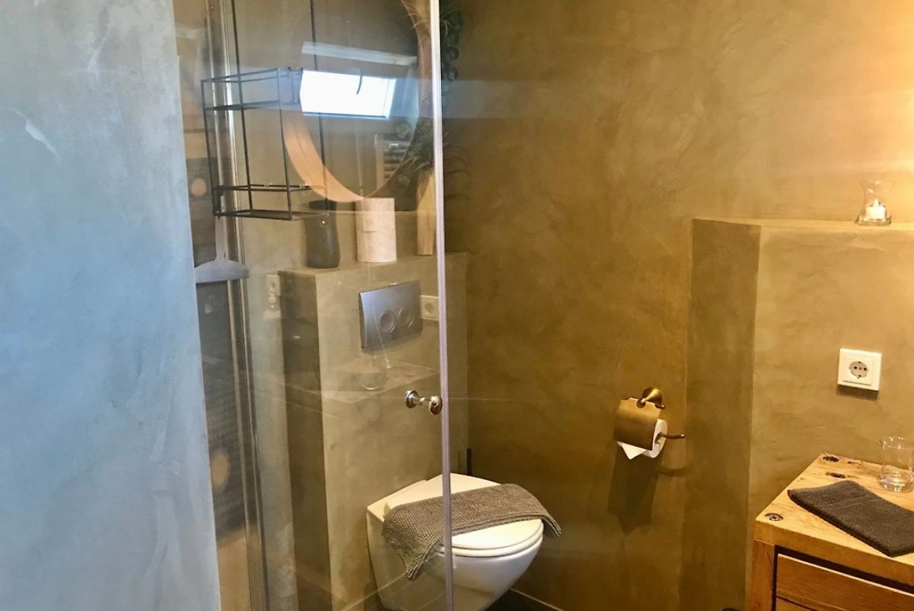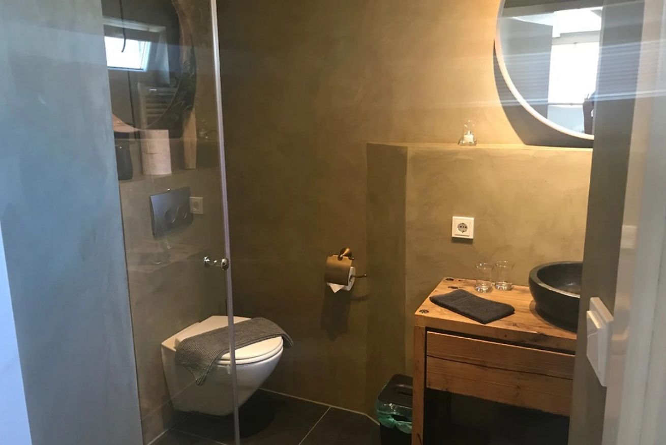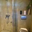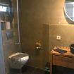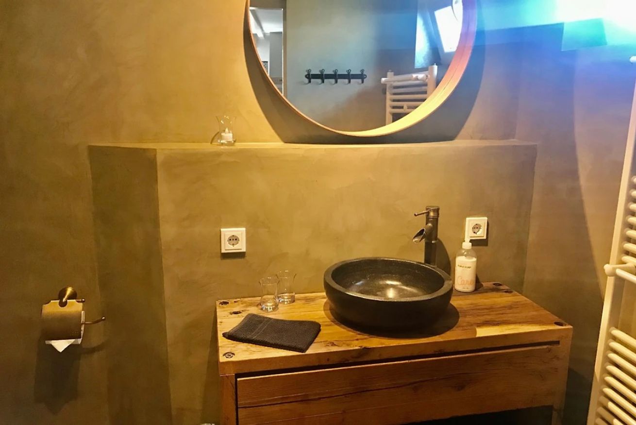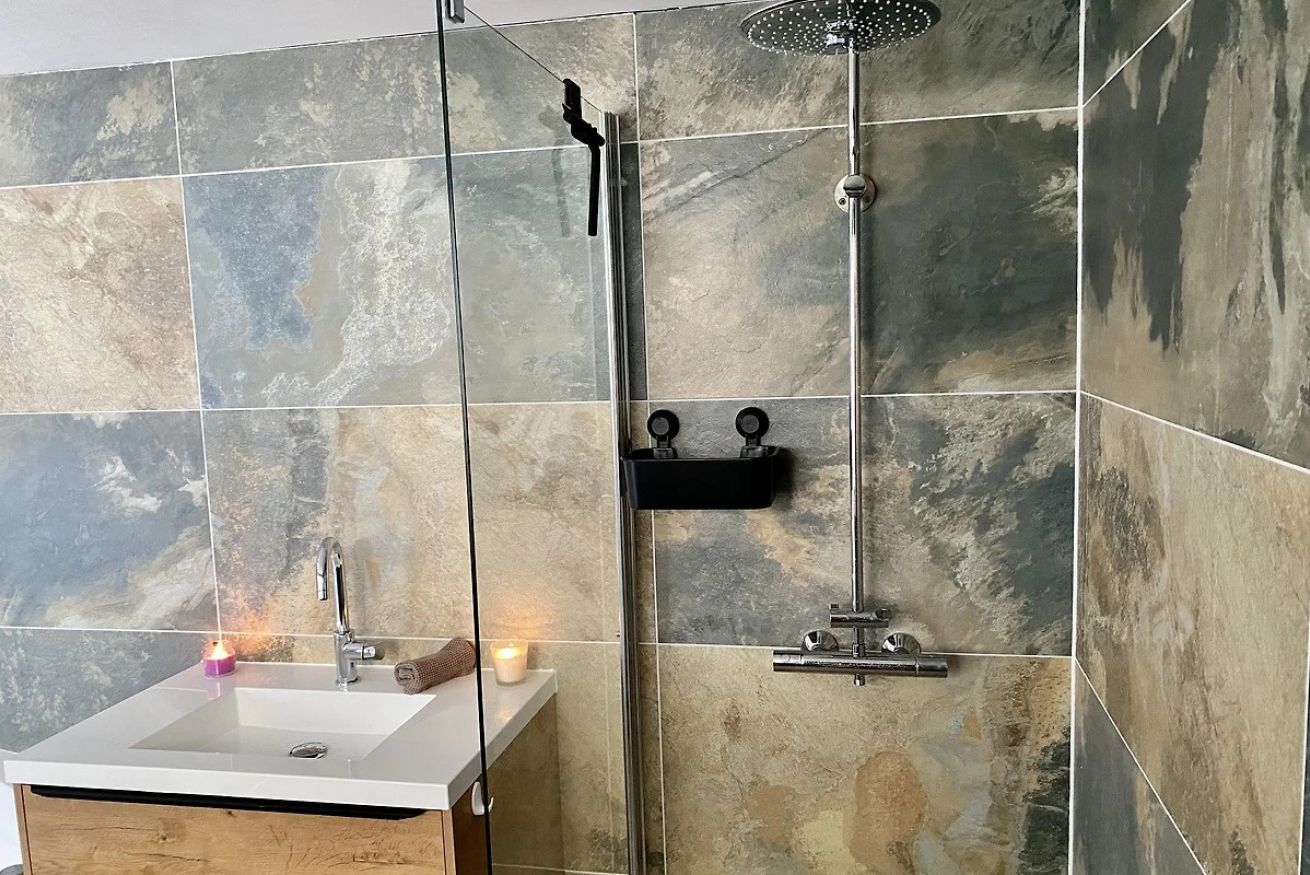 Das stilvolle Badezimmer ist modern eingerichtet und verfügt über eine ebenerdige Dusche.